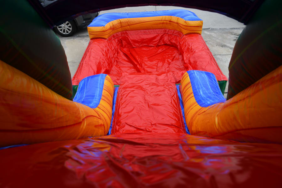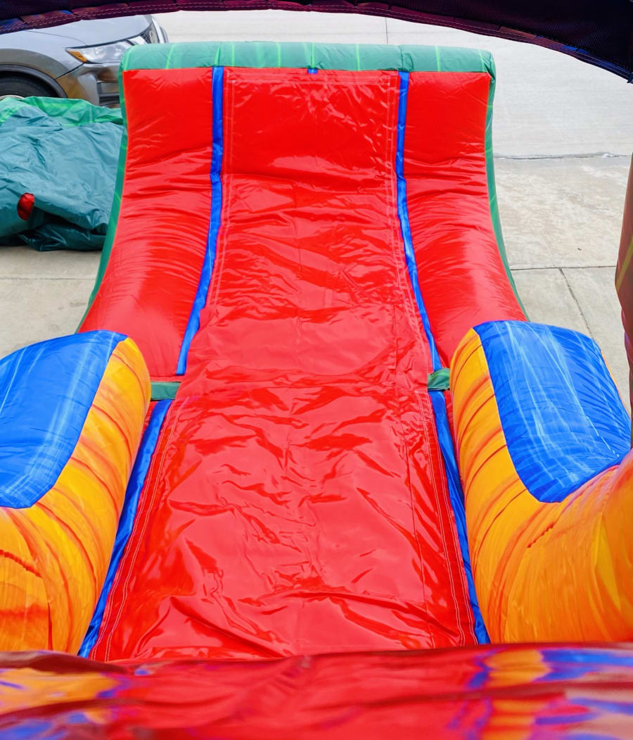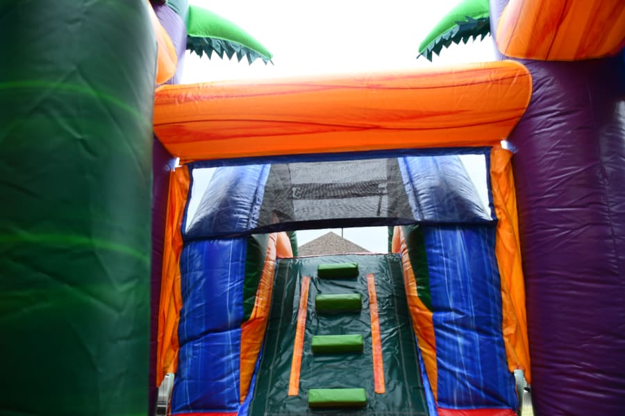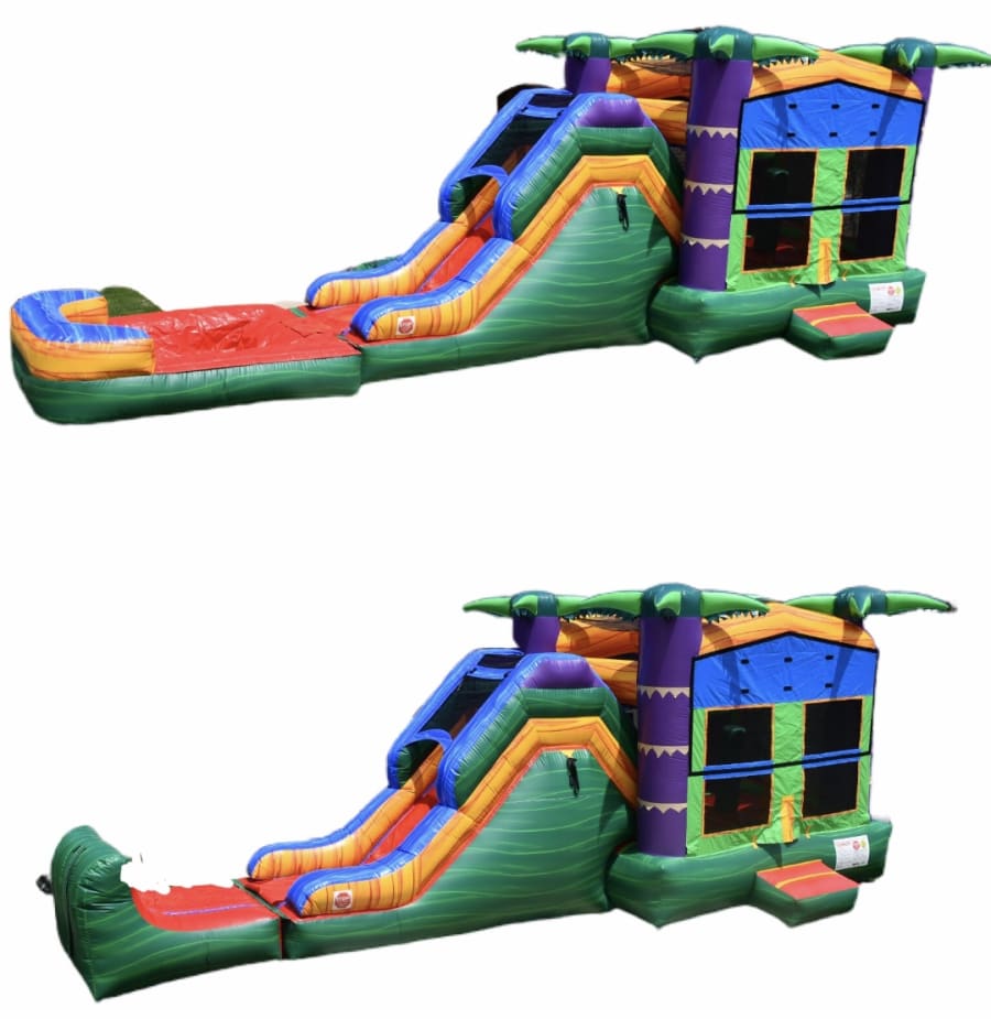Our Single Slide Tropical Combo is the most versatile unit ini inventory. It can be used dry w/stopper, w/stopper or wet w/pool. When wet the water will continuously trickle down the slide as kids slide into the wall or right into the pool. This combo has a spacious area to bounce with basketball hoop inside for some added fun.